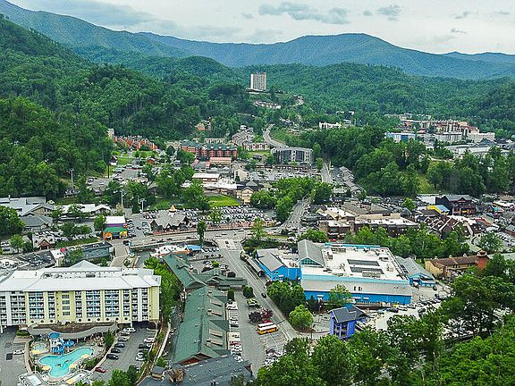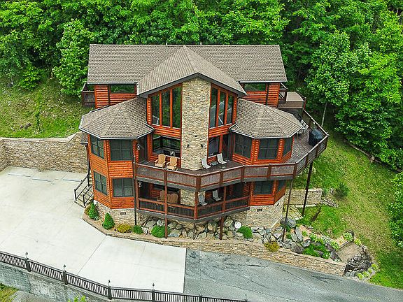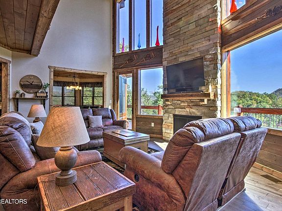 Discover mountain living at its finest with this incredible 4,200+ sq ft log cabin in Gatlinburg. This home features 5 bedrooms PLUS a set of custom bunk beds, 5.5 bathrooms, and stunning Smoky Mountain and Gatlinburg city views. Perched just minutes from downtown Gatlinburg's shops and attractions, as well as the entrance to the Great Smoky Mountains National Park, the location is unbeatable. It's practically walking distance to the Gatlinburg Aquarium in the middle of town. Take in panoramic views of the Smokies and downtown from the cabin's multiple decks and balcony levels! The main level features an open living room with fireplace, formal dining area, full kitchen, second dining space, and a luxurious primary suite. Upstairs you'll find two more bedrooms with private baths and an open loft den. The walk-out lower level has a large recreation room with fireplace, 2 bedrooms plus bunk beds, and two full baths. Well-appointed living spaces, prime location near amenities, and those breathtaking Smoky Mountain views make it a spectacular find. Schedule your tour today. *Some pictures may differ in decor/furniture in person*