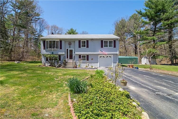 This lovely 3 bed 2 full bath raised ranch is situated on 3.23 acres of beautiful wooded land that even has a peaceful running brook, the lot is easy to walk as it has a park like feel. The kitchen was updated recently, with modern granite counters and stainless steel appliances, an under mount stainless double sink. Off of the kitchen, through a slider there's a beautiful Sun Room(10x14 heat&A C) that the owners have loved for the last 16 yrs. It leads to a double level wood deck and 24 round above ground pool(new liner 2 years ago, reg. maintained pool). The property has nice storage sheds besides also having a roomy 1 car garage. The home has an open floor plan from kitchen to living room and has 3 bedrooms and 1 full bath with tub&shower on the main level. Downstairs you will find a cozy living and extra dining family entertainment area which houses a great wood burning stove which is regularly maintained and used, another bedroom and full bath w stand up enclosed shower downstairs. The laundry room, home utilities room and the attached garage are also on the lower level. More features are Central A C, generator hook up as well as the generator, automatic garage door and openers. Newer storm windows, and a new roof only 3 years ago. The driveway is paved parking for 6+vehicles. Beautiful established vegetable gardens are already in bloom in the yard. Private well and septic system. Come and see this house in this country setting but less than 30 minutes to Prov.