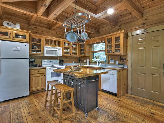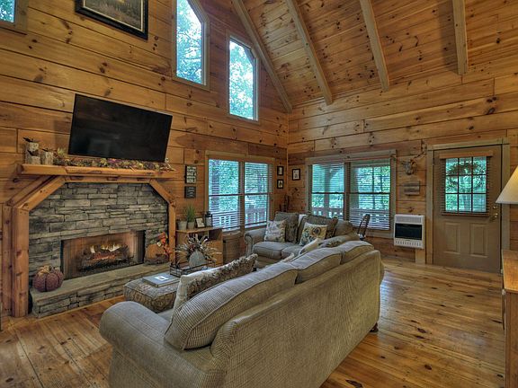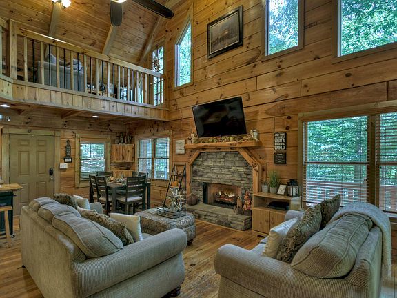 Gorgeous, completely private log home w/ deeded Toccoa River Access! This charming 3/2 features an inviting great room w/ stacked stone fireplace, open kitchen & adjacent dining area. Master on main features ensuite bath w/jetted tub & walk in shower. Travel upstairs to find a cozy reading loft, coffee bar area & private balcony. Two spacious bedrooms w/ Jack & Jill bath w/shower & tub combo round out the upstairs. Separate bunk house out back offers additional sleeping quarters or teen hangout. Enjoy the great outdoors w/ a park like setting complete w/ fire pit area, hot tub, & screened porch. Complete privacy w/ your own trail! Oversized 2 car garage plus a huge workshop! All paved access w/ no steep hills. Easy drive to shared Toccoa River access & centrally located to downtown Blue Ridge & McCaysville. Offered fully furnished. Short term rentals are no longer allowed per the HOA.