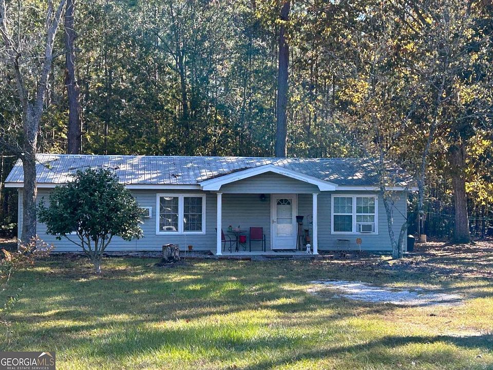 The property sits on just over 2 acres of mostly wooded land. The home features a metal roof and vinyl siding exterior. It is 1,104 sqft with three bedrooms, one bathroom, a living room, a laundry room, and an additional 552 sqft large, enclosed room that can be utilized for additional space for living space and entertaining.
