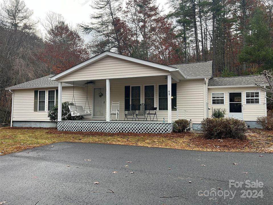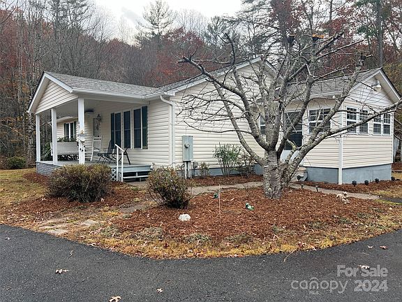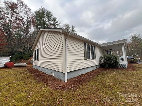 This property features a secluded two-bedroom, two-bath modular home situated on 1.49 acres at the end of a road. It includes a small water branch on the premises and has a large front porch with a wheelchair ramp for accessibility. A new roof was installed in 2024, and there is an asphalt driveway leading to a metal carport that accommodates two vehicles. The home has durable vinyl siding and an additional outbuilding in the backyard, providing extra storage or utility space.