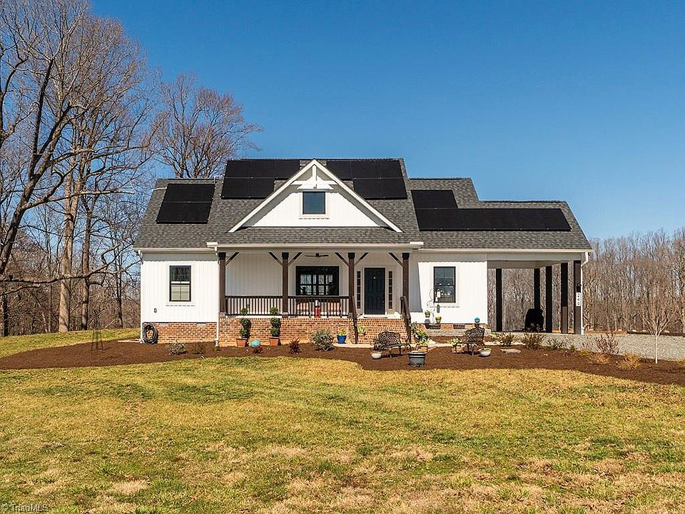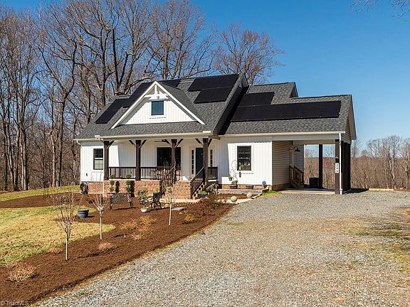 This beautiful 2-bed, 2.5-bath home, sits on over 32 acres of scenic farmland in Reidsville, NC, offering modern comfort and stunning countryside views. Spacious layout featuring vinyl plank, tile, and carpet flooring. Second story loft provides additional living space. Primary suite boasts a separate tub and a walk-in shower, while the second bathroom includes a tub/shower combination. Kitchen with quartz countertops, stainless steel appliances, and island with a breakfast bar. Enjoy meals in the adjoining dining area, or step outside onto the large patio or covered porch to take in the breathtaking views of the outdoors. Additional features include main-level laundry room, energy-efficient solar panels, and additional storage with a shed and two tobacco barns. Zoned agricultural, offers endless possibilities for horses or farming. This property offers the perfect blend of modern living, rural charm while enjoying your own private oasis, within minutes of downtown Reidsville.