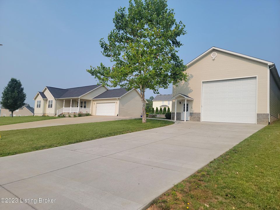WOW! Gorgeous home with tons of updates and a Massive 48x30 building (ext dimensions) The building comes complete with a finished office with kitchenette, half bath, and on its own meter and driveway. Large 14x16 door which should fit almost all recreational vehicles. All windows except the kitchen replaced in 2020. The home has LVP flooring throughout The kitchen boasts newly remodeled granite countertops, breakfast island, faucet, composite sinks, tiled backsplash and tons of pantry space. The master suite offers 2 closets and completely remodeled bath including tiled step in shower, new mirror, light fixtures, towel bar, toilet and marble vanity with soft close drawers. Completely tiled basement with family room, bar, 2 additional rooms and full bath. Newer HVAC. Step into a relaxing oasis ready to entertain with a custom paver patio complete with a covered outdoor kitchen including prep area and sink. Covered sitting area and fire pit. The retaining wall gives you even more privacy with private landscaping. Large front porch and conveniently located close to Elizabethtown and !-65 and Both parkway access.