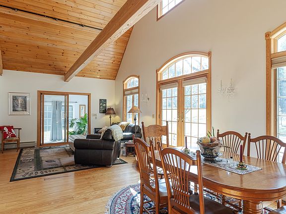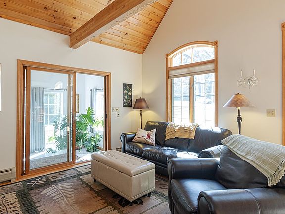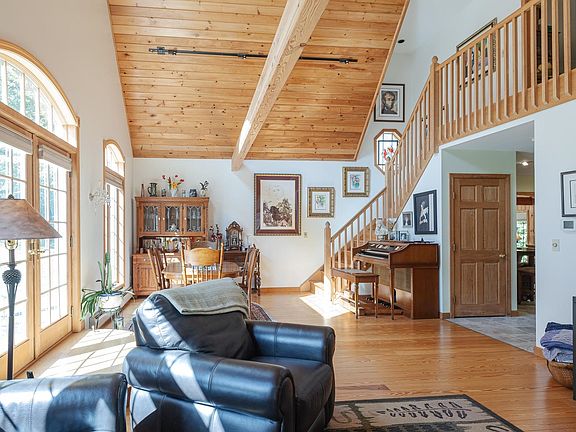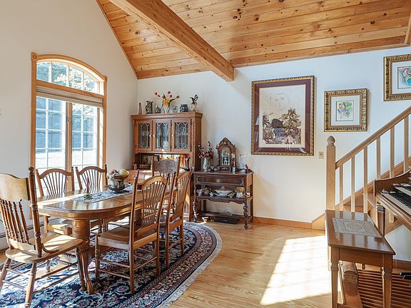 Charming sunny contemporary 3 bedrooms 3 bath home bordered by beautiful babbling brook. Soaring ceilings in the living and dining area gives the home an open lodge feel. Sunroom for plants, hot tub or a sunny office just off the living room with sliders to the outside. Large eat in kitchen with updated appliances. Family room off the kitchen has glass pocket doors and very efficient pellet stove that will heat the first floor and keep oil bills low. Completing the first floor is a spacious ensuite bedroom. The second floor contains two bedrooms and full bath. Both bedrooms have access to back deck. A two car detached garage with storage above and fun bonus ‘cabin’ that can be re-envisioned as a guest house, play house or just a handy large shed. The home is set back from the road and has a circular driveway and plenty of lawn for games or gardening. Would you like a pond? This home comes with its own dam which can be closed to make a pond or left open to allow the brook to flow by. Relaxing by the brook or enjoying this sun filled home you’ll find your happy place.