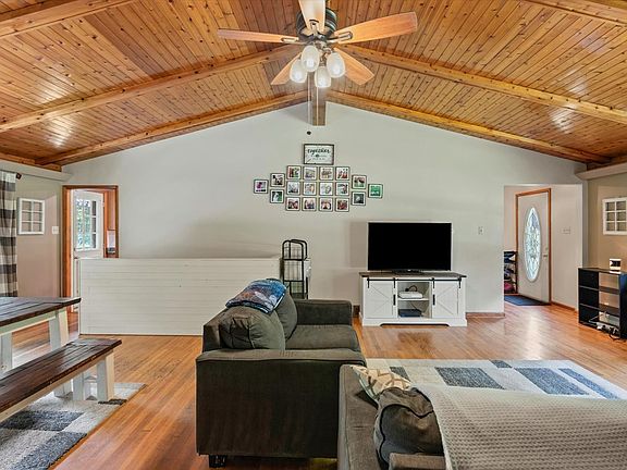 This serene 3-bedroom, 2-bath home on a 3.25-acre level lot offers the perfect blend of tranquility and convenience. The property features a 2-car under-garage and a spacious back deck overlooking a private yard. Inside, the kitchen is equipped with modern appliances, ample storage, and a breakfast bar. The living room impresses with cathedral ceilings, solid oak flooring, a custom stone wood-burning fireplace, and abundant natural light from a wall of windows, providing over 500 square feet of gathering space. The hallway leads to a laundry room, an updated full bathroom, two generously sized bedrooms, and a primary bedroom with space for a king-sized bed and an ensuite. The entire house has been freshly painted and fitted with energy-efficient lighting. A second parcel includes a 1,900 sq ft building and a small shed, both with tin siding and roofs, plus a 200-amp electrified panel. Enjoy hunting on 289 acres of leased land nearby for an estimated $200 per year.