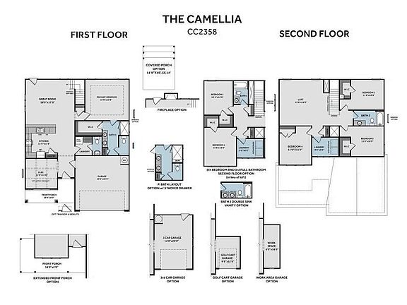 Camellia. Upon entering the home, a formal dining room with optional coffered ceilings and wainscotting is located off of the foyer with access to the kitchen. The kitchen has plenty of countertop space with a sink overlooking the great room, bar seating, and a pantry. The entryway mudroom space to the garage includes an option for a built-in drop zone and access to the powder room. The open great room features an optional fireplace along the back wall and access to the back patio OR optional covered porch. *Please note: Home cannot include the fireplace option without the covered porch. The spacious first-floor primary suite is located off the great room and includes a tray ceiling option. The primary bathroom features a large walk-in closet, private water closet, linen closet, double vanity sink with stacked drawer option, and walk-in shower. The second floor features a family loft atop the stairs with hall access to 3 additional bedrooms with walk-in closets, laundry room, and full bathroom with double vanity option. Optional additional fifth bedroom with walk-in closet, full bathroom, and linen closet in lieu of the family loft. Optional extension of the front porch. 2-car garage with multiple garage layout options available, including work area bump out, golf cart garage, and 3rd-car garage options. Garage option availability is homesite and community-dependent.