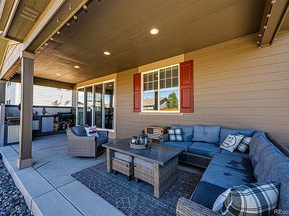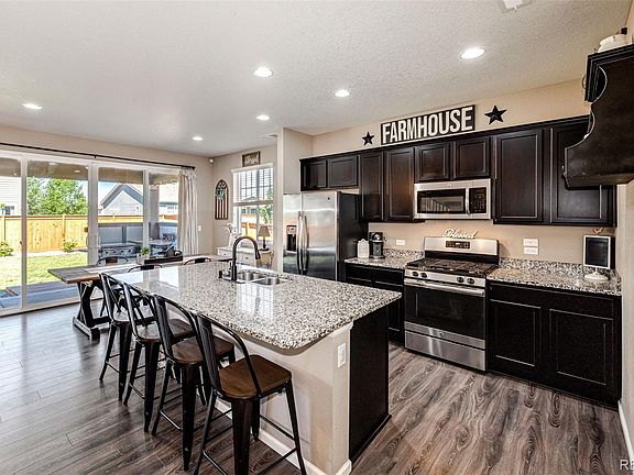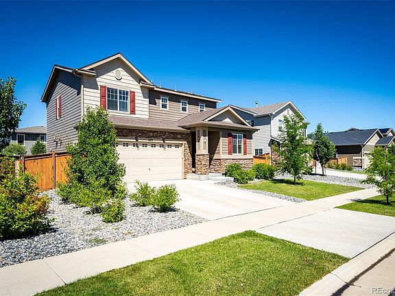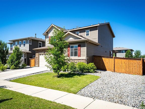 Sellers are offering $10,000 toward closing costs/interest rate reduction with full price offer! Just move in and enjoy. Get ready to make your home ownership dreams come true with incredible 4-season outdoor living space, upgraded kitchen and open floor plan. Here’s a kitchen to please everyone, with a pantry, gas stove and oversized granite island with seating that overlooks the bright and beautiful dining area with oversized sliding door. The great room has fantastic natural light is large enough to fit the biggest, snuggliest sectional you can find! The main floor bedroom can be used as an office or playroom if you like. Retreat upstairs to the luxurious primary bedroom and enjoy the attached bath, oversized shower and dual sinks. Storage is a breeze with the large walk-in closet. Two additional upstairs bedrooms will impress with their size, and the full bathroom in the hall already has plumbing to add a second sink if desired! The second floor laundry room saves time and hassle. The private, fenced yard features an extended covered patio and outdoor kitchen for unparalleled year-round enjoyment. Entertain friends and family or just unwind in your amazing back yard. Ready to grill and gather around your awesome outdoor kitchen? All the exterior appliances stay – ready for year round BBQ and fun. The oversized 2-car garage has room for storage and there is a huge heated/cooled storage area with access through the front hall closet. The Traditions community includes a pool, clubhouse and playground with an affordable HOA! Only 10 minutes to Buckley and close to DIA, E-470 and everywhere you want to be! Welcome home.