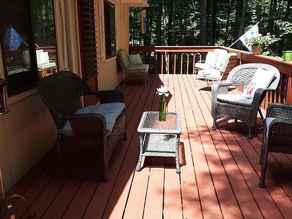 MOVE IN READY! Nestled in the woods on almost a half acre in amenity filled Locust Lake. Deck newly stained & house in & out newly painted. Large wrap around deck. Double paned windows throughout. Stone fireplace in living room to snuggle. New laminate flooring & newer carpet. 2 ceiling fans + heat pump. Upstairs bath newly renovated. Breakfast bar in kitchen,, large open floor plan with cathedral ceiling in LR, DR & kitchen, makes it nice & bright. Ductless a/c upstairs. Family room w/half bath & hookup for large capacity stackable washer & dryer. Garage & shed for more storage. Lots of closets. Within walking distance to beach. Great rental property, or your home away from home. Long driveway enough for 6 cars. This home won't last long, call today. Furniture neg
