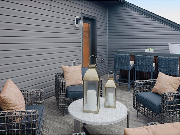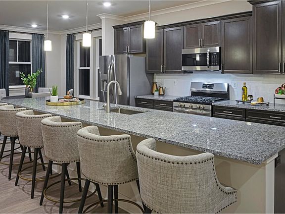This beautiful, four-level Easton style townhome is an absolute must-see! In addition to the 4 bedrooms, 3 full and 2 half bathrooms, and 2-car garage, this home offers a stunning open concept design with oversized kitchen peninsula and a luxurious owner's suite with spa-like bathroom. This home Designer Select upgraded appliances and finishes, the spacious Center kitchen layout, with big breakfast and bar style counter , 20' x 12' composite deck off the main level, a front-loading washer & dryer, custom window blinds, ceiling Fans and an added 4th -floor loft bonus room with rooftop terrace with stunning views to the golf course.