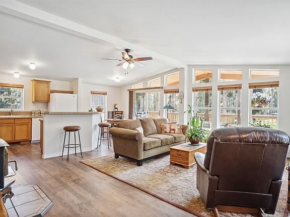 - Ceiling Fan(s), Eat-in Kitchen, Kitchen Island, Laminate Counters, Primary Suite, Open Floorplan, Sauna, Vaulted Ceiling(s), Wood Burning Stove