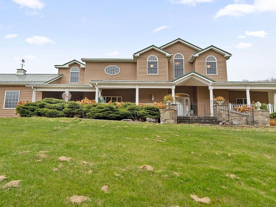 Nestled atop a long, private driveway overlooking the valley, this custom-built 1998 villa-style contemporary home offers stunning views and over 3,000 sq ft of elegant living space.Step into a grand main room featuring vaulted ceilings, prestigious pillars, floor-to-ceiling windows, and a striking two-sided fireplace, perfect for cozy evenings. Solid red oak floors flow throughout, complemented by custom oak built-ins with crown, and dental molding accents.There is an elegant kitchen with modern appliances, two bedrooms and a full bath on the main floor.The upstairs master suite is a true retreat with its own propane fireplace, an expansive bathroom with a jetted tub, stand-up shower, and a generous walk-in closet.Walk outside from the main living room onto an expansive patio with inground pool and pergola.The property stretches across the road and includes a large barn.With 3 bedrooms, 2 baths, and a full walkout basement, this home blends timeless charm with modern comfort.Call Now.