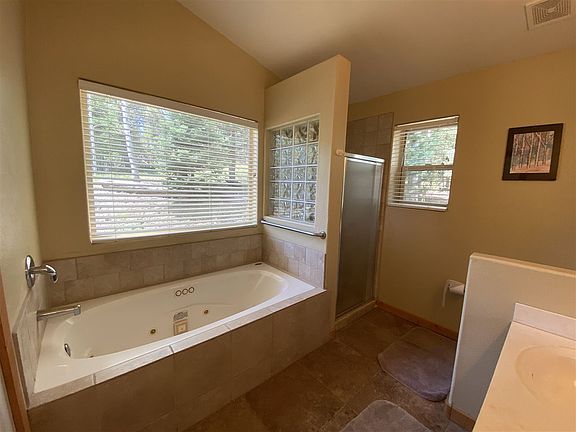Hidden gem within the resort that has single level living and a paved driveway awaiting for you to arrive. This home has three good size bedrooms, a master bath with spa tub and shower, and another bathroom that has a tub\shower combo. This home offers an open kitchen living area with granite counter tops and a pantry. There is plenty of storage and nooks for art to be displayed elegantly throughout the home. Wasted space was not an option for these home owners. Front and back porches, with easy access to each that will give you some extra living area to entertain and enjoy the great outdoors.