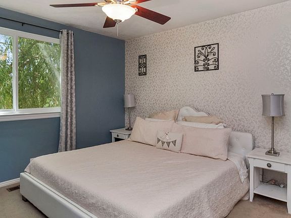 Beautiful updated and well-maintained home in cul-de-sac. Yard is a gem with BB court, finished children's play area with rubber ground cover, garden area with watering system, rose bushes, flower beds and fruit trees. Large shade trees and deck make the yard enjoyable! New bedroom windows and water heater Remodeled bathrooms and professionally finished white cabinets in kitchen. Walk to school and park! Updates throughout. This is truly one of a kind!