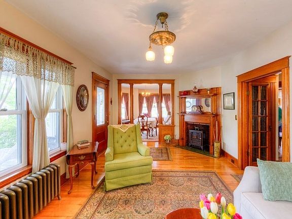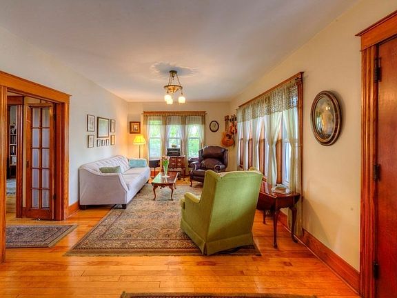 Perfect blend of old world charm and modern conveniences in this well cared for home. Sweeping front porch along the entire width of the house. Gleaming hardwoods and natural woodwork throughout. Stately columns and french doors grace several rooms. China cabinet and loads of nooks and crannies. Large living room with lots of windows, Dining room with china cabinet and stained glass window, Fully applianced eat in kitchen with quartz counter top, Large family room with a wall of cabinets, drawers and 2 built in desks. Convenient first floor laundry, Primary bedroom with "sleeping porch", second bedroom has built in cabinet and drawers plus 2 huge walk in closets, third bedroom has a wall of cabinets, shelves and drawers. Need more storage? There's a third, large walk in closet! Enjoy a soak in the deep, claw foot tub after a stressful day. All replacement windows, updated roof, heat and 200 amp electric. Great highway access.