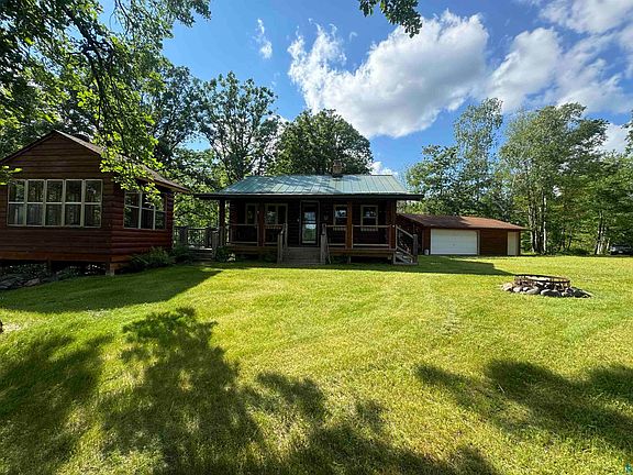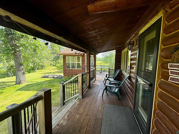 Enjoy the Solitude with a Long Winding Driveway to this Delightful Log Cabin! Imagine sitting on the picturesque front porch with your cup of coffee & overlooking the pond eastern sky! Open Living / Dining / Kitchen with vaulted ceilings. There is one bedroom on the main level with a drop down stair for possible sleeping in the small loft. Second bedroom & 3/4 bath in the lower walk out basement with a family room used for sleeping. Forced air furnace & central air for year round living. Outside you have a deck to a seasonal gazebo with electricity, two plus car garage with a small workshop/storage area, stationary & floating dock on the pond & a bridge over to the groomed trails meandering around a hillside & abuts the Pine River with part of the property across the Pine River which borders the Willard Munger Trail for additional recreational activity. Selling with most of the furniture. Close to area lakes, town, Banning Junction Park, General Andrews Forest & so much more!