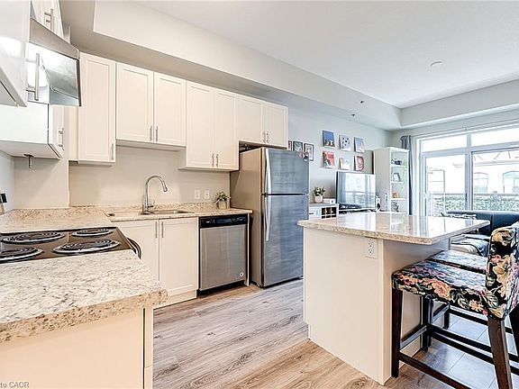 This exquisite penthouse 1-bedroom suite offers 608 sq. ft. of modern living space, featuring a sleek kitchen with stainless steel appliances, white cabinetry, ample storage, and a large island perfect for dining or entertaining. The open-concept layout flows into a bright living area with walk-out to a private balcony offering open views. The spacious bedroom includes a walk-in closet, while elegant laminate flooring and soaring 10-ft ceilings add style throughout. Known as the popular Nickel model, this layout is one of the best 1-bedroom designs in the building. Conveniently located just minutes to Hwy 407, 403, and the QEW, and within walking distance to shopping, transit, and the new hospital. Includes parking and locker. Amenities include a gym, yoga studio, party room, bike storage, and two rooftop terraces with escarpment and sunset views