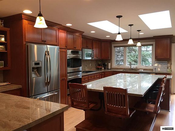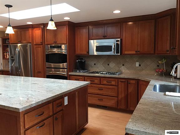 An Entertainer's Dream! The completely remodeled kitchen has granite countertops, custom cherry wood cabinets, stainless steel GE Profile appliances, a large stainless steel sink, a Moen touchless faucet and an instant hot water dispenser. Beautiful French doors lead to the private backyard complete with a multi-level deck, paver patio, gas fire-pit and a recycling creek water feature. Expansive views and access to the open space behind.