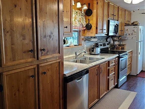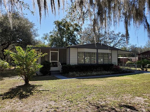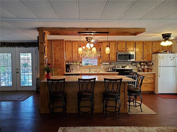Very nice doublewide on a large .54 acre lot with screened room and attached carport. (ramp not included) Utility room, storage shed, workshop and detached carport provides plenty of storage. Beautifully updated kitchen with huge eat-at bar plus stainless steel stove, microwave and dishwasher. Attractive vinyl wood plank flooring in living room and kitchen. Spacious master bedroom with walk-in closet and french doors to backyard. Most furniture included - Move in ready! Refrigerator new in 2019, a/c about 3 years old, septic pumped in 2020. Lot runs street to street for easy access. Back half of property is fenced. Optional $75 yearly fee allows access to the community lot on Little Lake Kerr with boat ramp and clubhouse.