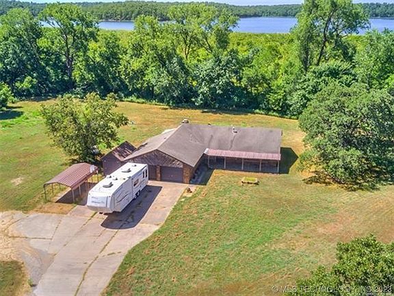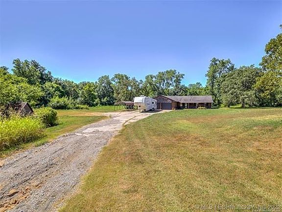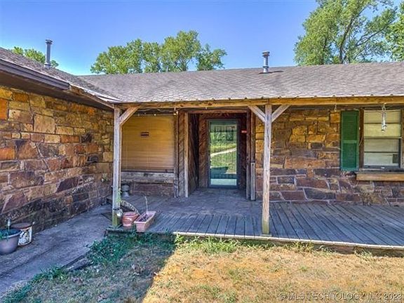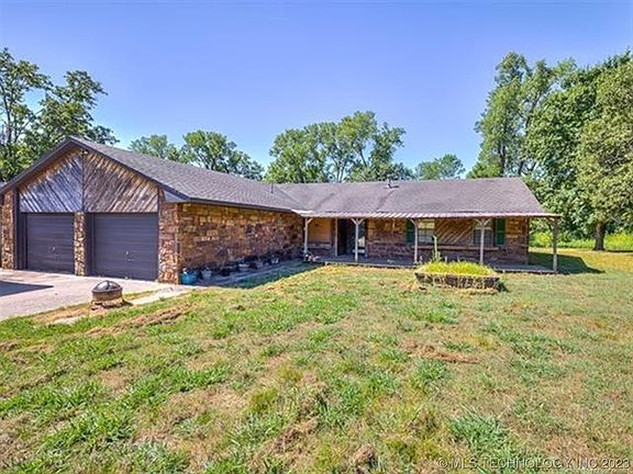 The home measures 1,604 Living SF with a 896 SF Garage. Currently there is an additional closet that has been built into the garage so there is enough space for a single vehicle and lawn mower to be stored, but the additional room can be easily removed to accommodate a second vehicle. The vaulted ceiling with exposed beams in the living area along with the natural stone fireplace (with gas starter) adds a lodge/rustic feel to the home. The flooring throughout the home is Wood, Laminate, and Tile. With the cabinets being Laminate and Ceramic. The exterior of the home has front and rear covered porches and a hot tub that will convey with the property. Exterior to the home there is a small storage shed, single carport, barn, and chicken coop. Claremore Creek flows along the Southern Boundary of the property. There is enough room to run a few horses, goats, or whatever you may choose for a small hobby farm. The nearest boat ramp on Hominy Lake is a half mile from the property and you are within 15 Minutes of the nearest boat ramp on Skiatook Lake.