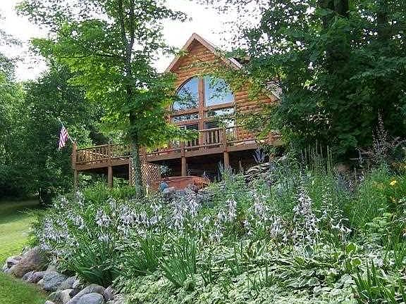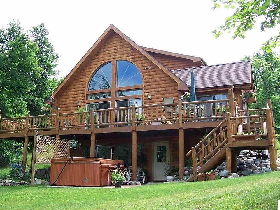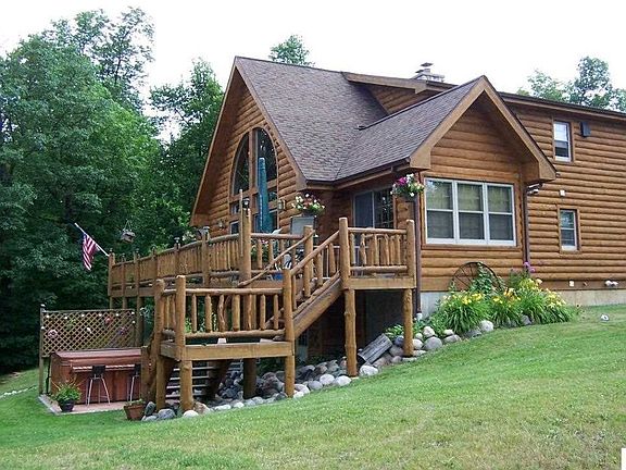You will fall in love with this amazing Wisconsin Log Home. Upon entering you first notice the impressive wall of sun-lit windows overlooking the water, open floor plan, the cultured stone fireplace, and hard wood flooring. Granite counter tops and stainless appliances complete the kitchen. Large upper level master bedroom and master bath with Jacuzzi and walk-in tile shower. Two comfortable size bedrooms, and bright, inviting sunroom complete the main level. Spend time relaxing on the expansive deck, or in the hot tub enjoying the beautiful landscaped property of over 3 acres, 2+ stall detached garage and 30x45 pole building allowing for ample storage. Little Jay Gould is part of the Pokegama chain of lakes giving you access to miles of fishing and recreation, take a leisure boat ride for a round of golf or visit the wonderful dining establishments. Close to walking and bike trails. Home is 2x6 wood frame construction, walls are over 12" thick and well insulated; sided w/6" half logs.
