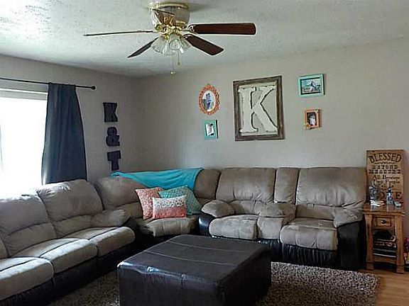 Super cute clean move in ready home w/extra large living area. Wood laminate flooring. Kitchen with stove, refrigerator & built in microwave. Kitchen is open to dining area. 2 bedrooms and 1 full bath with washer and dryer hookups. Ceiling fans. Walk in closets. Newer replacement windows. 2 car carport. Storm shelter, Chain link fenced back yard area. Barn and dog run on 1.25 acres. This is a great place. Little piece of country paradise.