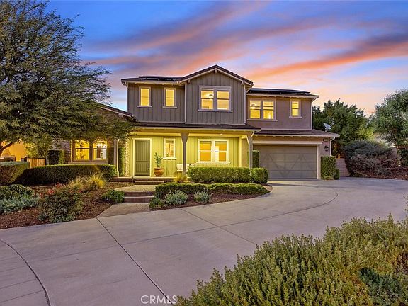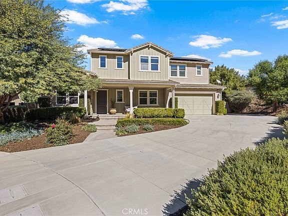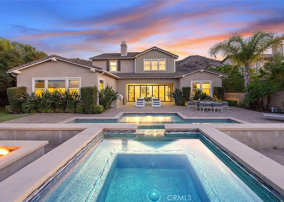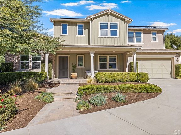 Overlooking the Santa Clarita Valley, this exquisite Southern Oaks 5 bedroom, 5 bathroom POOL, SPA and PANORAMIC VIEW executive home with OWNED SOLAR, 4 CAR GARAGE and DOWNSTAIRS PRIMARY SUITE offers privacy, elegance and modern design with sweeping mountain and valley views! One of only 20 homes in this exclusive community, this incredible home sits on a beautifully landscaped, private cul-de-sac FLAG lot with extra long driveway! Sophisticated upgrades both inside and out such as glass tile pool accents with sheer descents, custom pavers, in ground trampoline, built in BBQ and more! Step through the regal entry into a bright, open concept floor plan with soaring ceilings, fresh paint and carpet and! A flex room off the foyer which can serve as a formal dining room, family room or home office with direct access to the gourmet chef’s kitchen! The kitchen is an entertainer’s dream and truly the heart of the home, featuring quartz countertops, large center island with breakfast bar, double oven, stainless steel appliances, abundant cabinetry and butler’s pantry, complemented by an adjacent dining nook with backyard access with poolside views! Stacking sliding glass doors open to the sparkling pool, California Room style covered patio and built in BBQ! The spacious living room is accented by a designer stonework wall and also opens to the resort-style backyard complete with lounge and dining areas, fire pit adorned seating area framed by expansive mountain and valley views! The downstairs layout includes TWO MAIN FLOOR bedrooms. The DOWNSTAIRS PRIMARY SUITE is a luxurious retreat with a spa-like bathroom, soaking tub, walk-in tile shower, separate double sink vanities, and a huge walk-in closet with custom organizers and storage! The second downstairs bedroom offers a full bath and generous closet space, the ideal space for a private office or guest bedroom! Upstairs, the spacious loft overlooks the entry and has stunning mountain and valley views, a perfect media room! 3 additional upstairs bedrooms share 2 bathrooms, including a Jack-and-Jill bathroom, plus a convenient upstairs laundry room with sink and storage! Additional features include a 4 car tandem garage, PAID SOLAR, and NO MELLO ROOS! Situated in a highly desirable Stevenson Ranch neighborhood, this home is nearby top-rated schools, shopping, dining, and outdoor recreation, with quick freeway access! This is a home you will cherish years to come!
