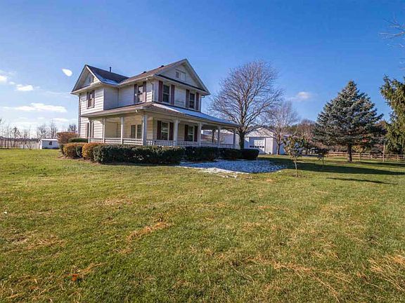 This immaculate 5 acre private property could be the home of your dreams!It has everything you need & more!2story home with a wraparound porch,5 bedrooms,2 full and 2 half bathrooms, main level office,large living room,separate dining room,family room with a wood burning fireplace & a updated kitchen with all new stainless steel appliances & granite countertops & backsplash.Main floor bedroom has its private half bath.4 bedrooms on the 2nd level have a separate cooling & heating system.Partial basement professionally waterproofed with lifetime warranty. Basement has a half bath,wood burning fireplace & a walkout to the backyard.New roof,new windows,newly poured black top driveway.Automatic front gate.Detached 2.5 car garage.Two large pole barns (40x48 & 26x105)perfect for your animals or vehicles.Kids will enjoy large above ground pool!Fenced garden (12x40),chicken coop,big backyard with mowed trails through treed areas, grove of walnut trees,great wood supply for your fireplaces!