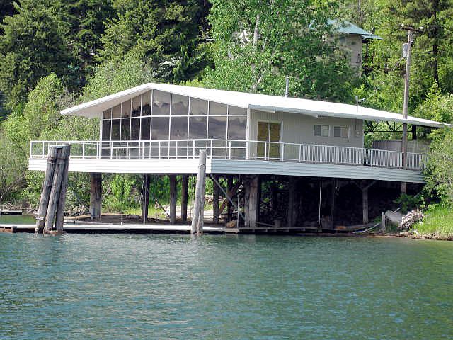 Rare waterfront home built OVER the water on pilings! Jump off the deck into the lake! 3BD/1BA, 1200+ SF of irreplaceable FUN! .25 acre lot with road frontage on Cleland Bay on CDA Lake. Floor to ceiling windows make you feel as though you are literally ON the water!
