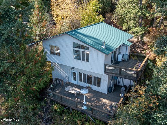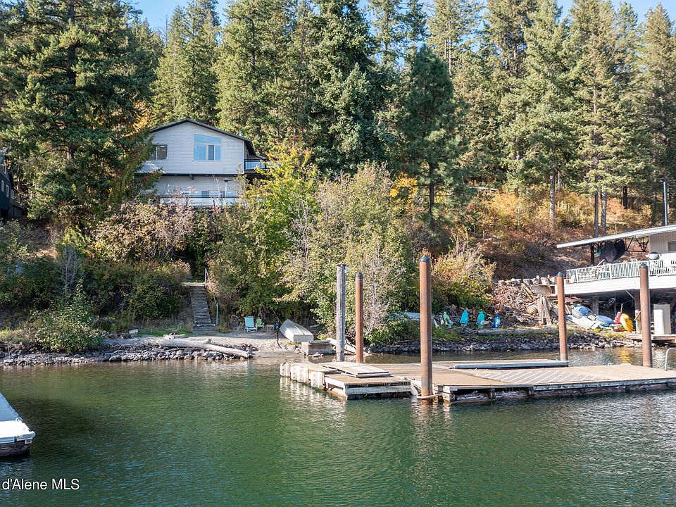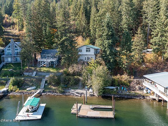 Lake Coeur d'Alene at Cleland Bay. Cozy lake cabin with 75' of frontage nestled among tall pine trees, with a serene view of the water just a few steps away. The cabin itself is made of rustic wood, giving it a warm and inviting feel. 4 bedrooms and 2 baths including A large porch wraps around the front, perfect for sitting with a cup of coffee in the morning or watching the sunset in the evening.