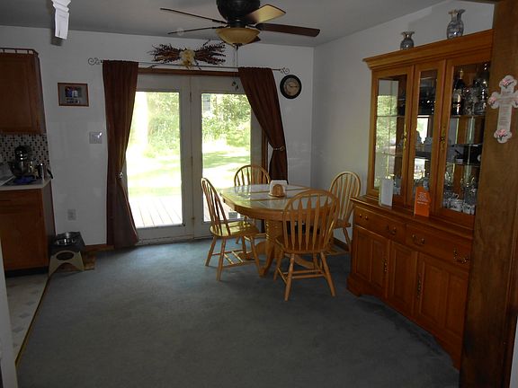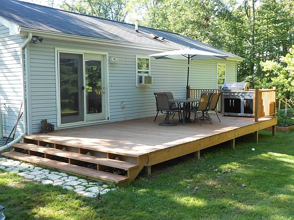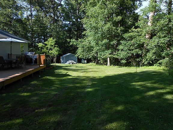 Very quiet, secluded setting in cove w/only 2 neighbors, best of both worlds w/nice cleared yard & woods. Kitchen w/newer tile backsplash. Dining rm off kitchen w/ French doors leading to lg newer deck (12x25) looking over yard and 24' above ground pool, complete w/fire pit & woods. Shed remains. Living rm complete w/real fireplace, floor to ceiling stone work, lg bay window. Front door leads out to yet another lg deck 28x7.5 to sit on & relax. Master bdrm w/his & her lg closets. Bdrm 2 also has lg closet. 3rd bdrm option in basement currently being used as rec rm, complete w/pellet stove as additional heat source. Plumbing hook up for second bathroom in basement.