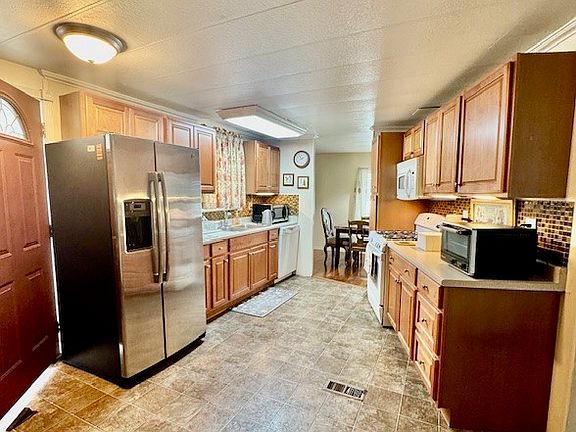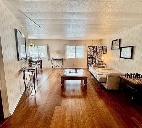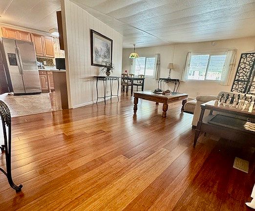 Welcome to this charming and move-in ready 2-bedroom, 2-bath mobile home located in a desirable 55+ community that welcomes residents aged 18 and over, provided the registered owner is 55+. Featuring an open-layout floor plan, this home boasts bamboo flooring throughout, creating a warm and inviting atmosphere. The kitchen and dining room are strategically placed in the home.The primary bedroom includes a charming vanity area, along with ample closet and storage space. Both bathrooms have been beautifully upgraded with walk-in showers. Enjoy additional flexibility with a spacious family room, which can be converted into a third bedroom or home office. The laundry room is conveniently located inside for easy access. The enclosed porch offers an excellent space for unwinding, and take advantage of the low-maintenance front landscaping adorned with fruit-bearing citrus trees. The home also features newly replaced front windows, a covered carport for two vehicles, and a storage shed. The backyard provides additional space for storage, offering room to add a shed or custom storage solution. As a resident of this prestigious community, you'll enjoy access to a variety of amenities, including a clubhouse, swimming pool, Jacuzzi, exercise room, shuffleboard courts, BBQ areas, and outdoor dining spaces – offering ample opportunities for relaxation and recreation. This outstanding community is conveniently located near hospitals, restaurants, parks, schools, shopping centers, grocery stores, and major freeways.