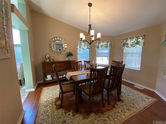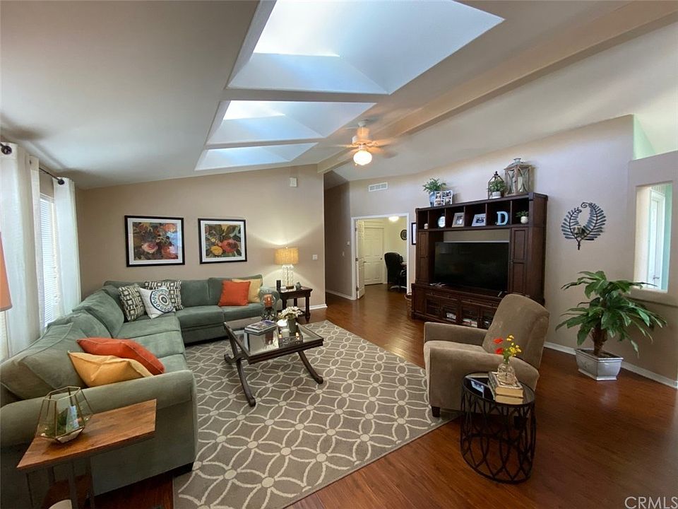 Beautiful 3 bedroom, 2 bath home with tasteful decor throughout. This well cared for property features stunning wood looking laminate flooring, vaulted ceilings with atrium windows, skylights letting natural light inside, ceiling fans, a large living room and separate dining room. The kitchen has newer high end stainless appliances including a 5 burner gas range, a center island, dinette, pantry and lots of windows. The spacious master bedroom has large his & hers closets, an ensuite bathroom with dual vanity and plenty of storage. There is a separate inside laundry room with built in desk area, washer and dryer are included. Enjoy the wonderful weather year round, relax or socialize on the over sized covered patio leading to the back yard with enough space for gardening. The covered carport has room for at least 2 cars and includes both a storage unit and shed. This wonderful active adult community requires just one occupant to be 55 or older. Amenities include a sparkling pool & spa, BBQ area, clubhouse, Billard Room, Card Room, gym, lawn bowling, day trips, shady greenbelts and more. Located with easy access to the Freeway, Shopping, Restaurants, Spectrum, Airport and more.