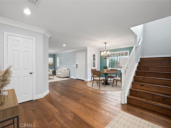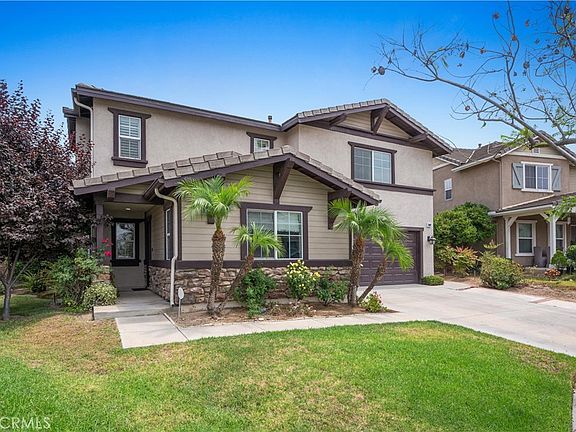 Welcome to 24922 Elmwood Street in Corona, a unique and upgraded move in ready home sitting on a 10,019SqFt Lot, nestled within the desirable community of Sycamore Creek. This exceptional two-story residence offers eco-friendly features and upscale finishes. The embellishment of crown molding and baseboards throughout the entire home add a touch of refinement to the living spaces, along with the charm of plantation shutters on the windows, allowing natural light to illuminate the rooms while providing privacy. The recently renovated kitchen offers an ample pantry space, quartz countertops, and water softener connected to the entire house, fully paid off. Then opening up to the family room with a cozy fireplace for cherished evenings with loved ones. It also has Downstairs bedroom with reach-in closet and easy access to the downstairs full bathroom. Upstairs, you'll find four bedrooms and two full bathrooms, with the master bedroom showcasing a solid wood custom wardrobe closet and an en-suite bathroom. Each bedroom upstairs features a WALK-IN CLOSET and ceiling fan for comfort and convenience. Step outside to discover a true oasis with a variety of fruit trees, a fire pit, and a drip system for easy maintenance in the backyard. The adjacent patio, complete with lights and fans, offers a picturesque setting for outdoor gatherings and relaxation. Both the patio and living room contain a surround sound system for an immersive audio experience both indoors and outdoors. This home also offers eco-friendly features such as solar panels and a 240volts 40amp electric car charger connection. Additional highlights include hardwood floors throughout the main level, carpet in the bedrooms, Ring cameras for added security, a shed for additional storage and a dual AC unit for year-round comfort. The community provides residents with various amenities, including two sports parks, pools, a gym, clubhouse, and more. Experience the epitome of comfort and style this home and community has to offer.
