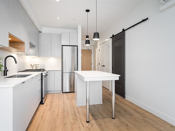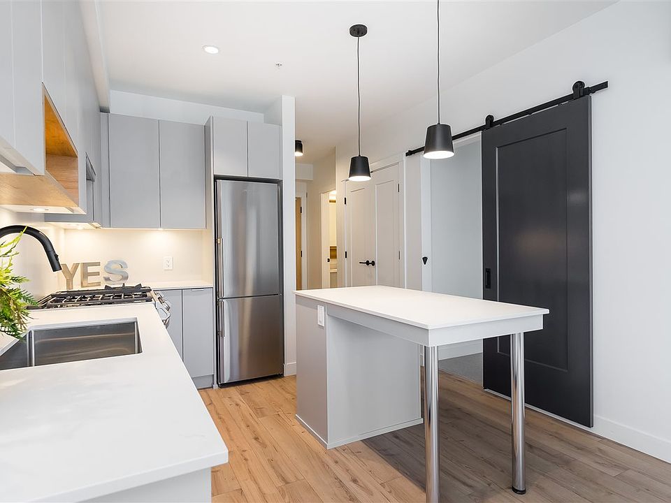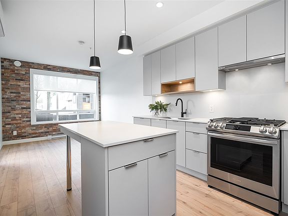Welcome home to Upper Montrose! This 1 bedroom PLUS den condo features an open concept layout. You will appreciate the upscale finishings throughout with stainless steel appliances, smart Samsung gas range, central air conditioning, barn door, quartz countertops and backsplash, exposed brick accent wall, concrete deck flooring, tray ceiling in master bedroom. Oversized patio with plenty of space for lounge furniture and/or dining set. All complete with 1 underground secure parking stall, storage locker and bike locker. Courtyard features a kids playground and raised gardens. Located in the historic downtown Abbotsford featuring boutiques, bars, restaurants, and farmers market just out your doorstep. Call today!
