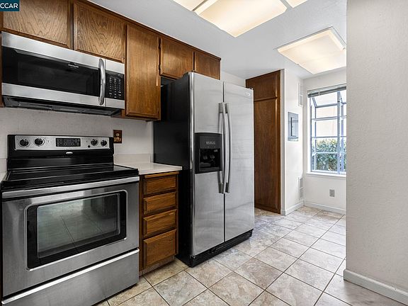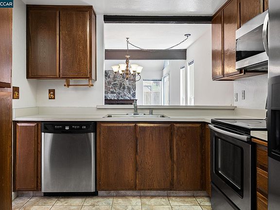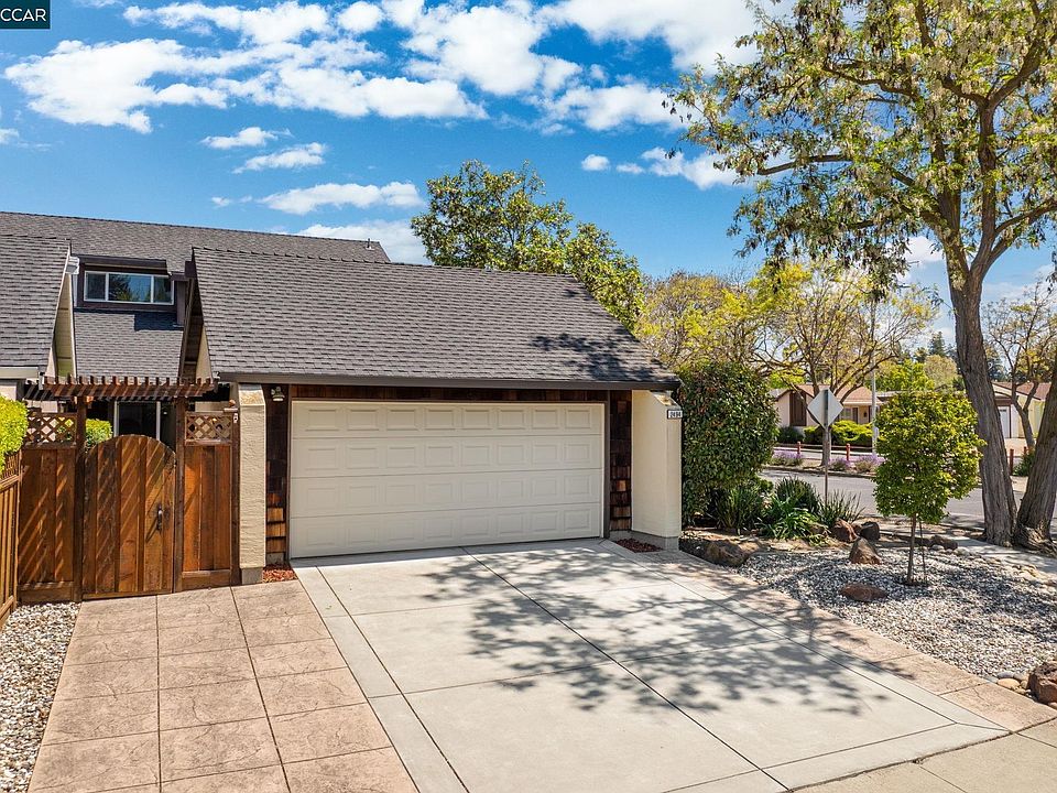 Set on a desirable corner lot with no HOA, this 3-bedroom, 2-bathroom duet offers a flexible layout and exceptional walkability to top-rated Pleasanton schools. The expansive living and dining area is anchored by a dramatic stone fireplace and enhanced by vaulted ceilings with exposed beams, creating a sense of volume and warmth. Rich wood-style flooring adds elegance, while large windows and a sliding glass door provide seamless indoor-outdoor flow—ideal for entertaining or everyday living. The kitchen blends classic style with everyday comfort, featuring warm wood cabinetry and a convenient passthrough to the dining area for easy hosting. Two bedrooms and a full bath are located on the main level, while the upper loft offers a private primary suite with en suite bath—perfect as a peaceful retreat or extended living for multigenerational needs. The backyard features a generous patio with plenty of space to play, entertain, or add garden beds. A two-car garage with built-in storage completes the home. Ideally located within walking distance of Ken Mercer Sports Park, Walnut Grove Elementary, and Harvest Park Middle School, with Amador Valley High just a mile away. Also close to Stoneridge Shopping Center, BART, and major commuter routes.