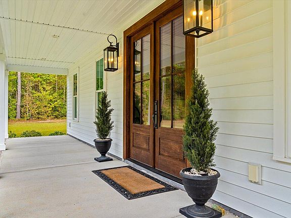 Set on 6.98 beautiful acres surrounded by tranquil woods, this exquisite single-story residence harmonizes modern luxury with rustic appeal. Spanning 2,473 square feet, this thoughtfully designed three-bedroom, two-half-bath home features an inviting open floor plan perfect for relaxation and entertaining.As you arrive, you'll be greeted by charming front and back porches that enhance the home's curb appeal while protecting interiors from direct sunlight, ensuring a cool and comfortable atmosphere. Step inside to discover stunning LVP hardwood flooring that flows gracefully throughout, adding warmth and elegance to every space. The expansive living area sits at the heart of the home, thoughtfully positioned between the primary suite and two additional bedrooms,providing both privacy and convenience for everyone. The gourmet kitchen is a chef's dream, featuring a beautiful farm sink, dual ovens, an electric cooktop, and a spacious island ideal for gatherings. A butler's pantry offers ample storage for a tidy and organized cooking experience, while the conveniently located laundry room adds functionality and style, with easy access to the breathtaking rear entrance. The primary suite serves as a true sanctuary, boasting large walk-through closets that offer generous storage solutions. Both additional bedrooms are spacious and well-appointed, ensuring comfort and privacy for family and guests alike. Built on an elevated slab, this home showcases durable premium vinyl siding and a 26-gauge standing seam galvanized roof, promising low maintenance and sustainability. Impact-rated windows and doors provide peace of mind and superior protection against the elements, while open cell spray foam insulation in the attic ensures energy efficiency and comfortable indoor temperatures throughout the year. Whether you're soaking in the stunning views from the front porch or hosting summer barbecues on the back porch, this home is designed for seamless indoor-outdoor living. Experience the epitome of modern country living in this exceptional property, where every detail has been thoughtfully crafted for comfort, style, and practicality. Your idyllic retreat is waiting call today for your private tour! "This property includes a spacious, insulated 30x60 three-bay garage, designed to accommodate multiple vehicles and provide ample workspace. With durable foam insulation, the garage offers excellent temperature control, ideal for vehicle storage, workshop activities, or hobbies in any season. Each bay has its own entrance, allowing for versatile use and easy access."