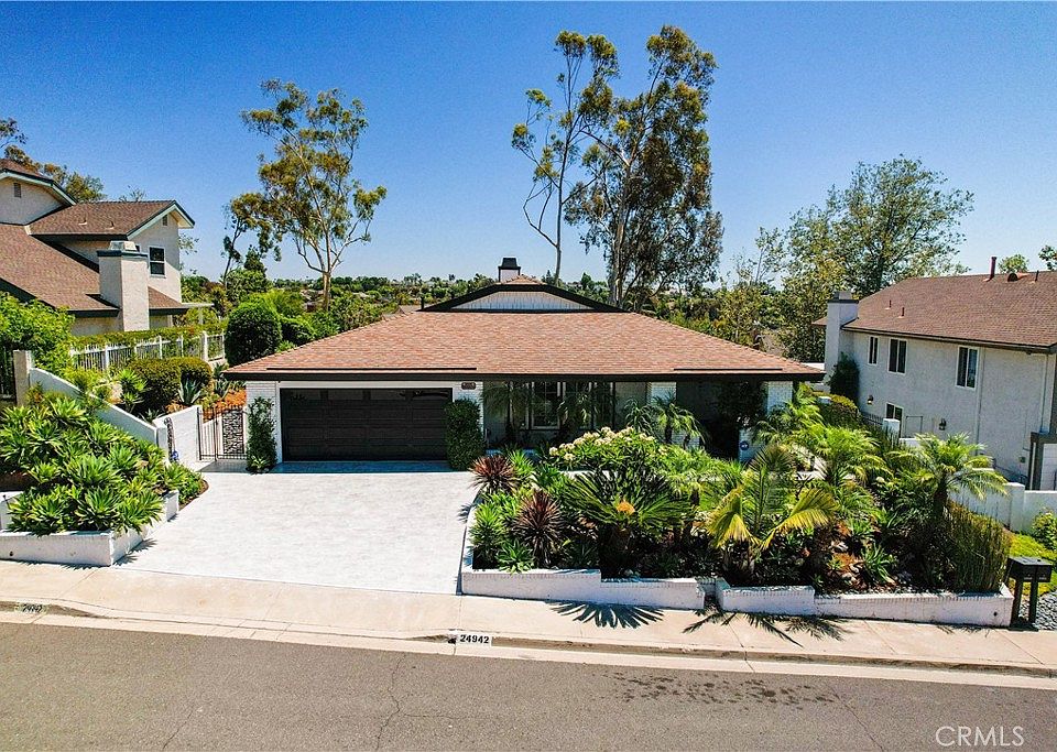 Welcome to this beautifully reimagined single-story home offering over 2,100 square feet of luxurious living space, located in the sought-after Stratford Ridge community, right next to the prestigious Nellie Gail Ranch. Perched on an oversized lot with breathtaking panoramic views, this rare gem combines elegance, comfort, and location—all with no HOA and a low tax rate. Step inside to an expansive, airy open-concept floor plan with soaring vaulted ceilings, abundant natural light, and top-tier finishes throughout. No detail has been overlooked! The home has been tastefully renovated! The newly constructed chef’s kitchen showcases an oversized island with storage, custom cabinetry, sleek countertops, and high-end appliances—perfect for entertaining or everyday living. Both spa-like bathrooms have been completely remodeled, and the home features new flooring, new drywall, new doors and windows, fresh interior and exterior paint, all new HVAC, water heater, and whole-house re-pipe—everything has been done for you. Enjoy the professionally landscaped backyard featuring beautiful mature plants and a variety of fruit trees, ideal for relaxing, entertaining, or gardening in your own private retreat. This turn-key home is a rare offering in a quiet, established neighborhood just minutes from beaches, top-rated schools, shopping, dining, and major freeways. Move right in and make 24942 Del Monte, Laguna Hills you next home! Stunning Fully Renovated Single-Story California Dream View Home in Stratford Ridge – No HOA & Low Tax Rate!