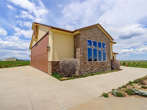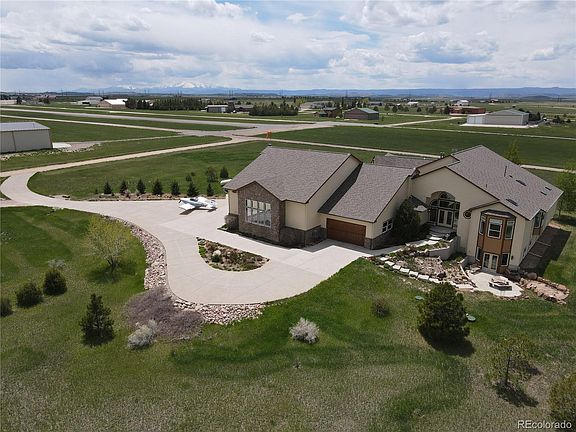 Live the ultimate aviation lifestyle in this stunning 4 bedroom, 3.5 bathroom ranch home located in the Kelly Air Park community in Elbert, CO. This property boasts an attached 57’ x 40’ insulated and heated airplane hangar with workshop, perfect for aircraft enthusiasts who want the convenience of storing their plane at home. Hangar adjoins the oversized 4 car garage which includes plenty of space for storage. The property is adjacent to the 3800' paved community runway with direct access. The spacious and bright interior offers ample living and entertaining space, with a large open kitchen including an island and eating nook. Vaulted living room with west facing windows to enjoy the panoramic mountain views and warmth of the fireplace as you watch the sky and runway in preparation for your next flight. The sunny atrium has floor to ceiling windows that offers majestic views of Pikes Peak. The primary suite includes a spa-like bath complete with heated soaking tub, steam shower and sauna. Main level is rounded out with two additional bedrooms (one is non-conforming), formal dining, full bathroom, powder room and large laundry/mud room with storage and access to the garage and hangar. The partially finished walkout basement offers a bedroom, ¾ bath, home theatre with gas fireplace, fitness room, and multipurpose space/kitchenette complete with wet bar and wine refrigerator. The unfinished portion of the basement provides plenty of space for storage or the potential to expand the current living space. This legacy property, situated on just over 4 acres with 360 degrees views, provides a unique opportunity to experience a luxurious lifestyle that combines both aviation and residential living. Don't miss out on the chance to tour this one-of-a-kind property.