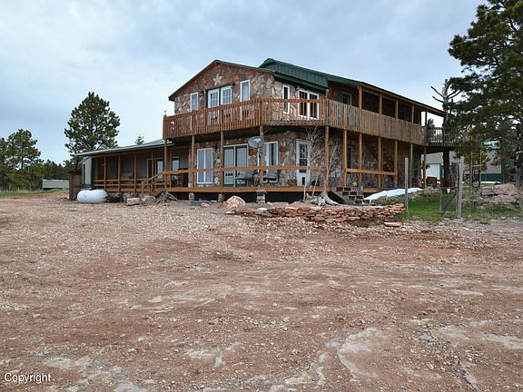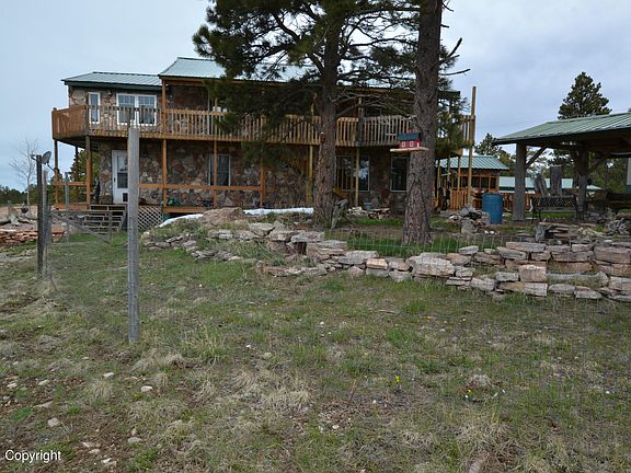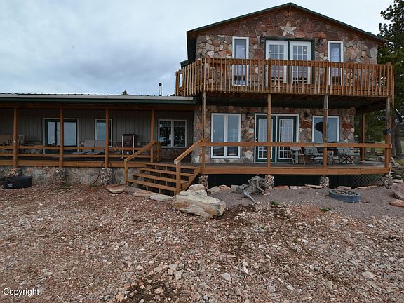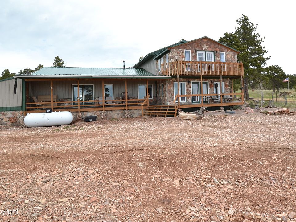 Amazing 5bd, 3 bath custom built house on 57 acres outside of town where you can enjoy the privacy and wildlife! Property has its own private well! Main level living with 2 living areas, 2 wood stoves, 1 pellet stove, Master Suite, full bath, laundry room and sunroom. The custom made log stairs lead up to 3 additional bedrooms, bathroom and office area. The 3rd bedroom upstairs leads out to the wrap around deck with views on a clear day to the Big Horns and Inyan Kara. Huge shop, barn with tack room, loafing shed and more. All new roofs on all buildings in 2020!