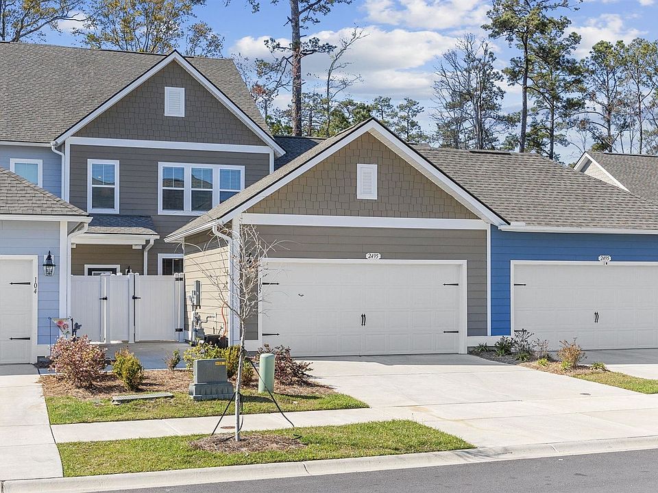 Welcome home to this lovely 3 bedroom, 2.5 bath true townhome in Belle Harbor in The Market Common! This townhome is turn key ready and better than new! It was built by Lennar and is their functional and spacious Pinehurst model. This townhome has a 2-car detached garage and two parking places outside and a private, gated, patio/courtyard. Inside there is an open living room, dining nook, breakfast bar and these options are perfect for entertaining. The kitchen has granite countertops, plenty of cabinet space, tile backsplash, gas range and premium GE appliances. All of the first floor has laminate flooring, crown molding, and upgraded fixtures. The laundry room and half bath are conveniently on the first floor as well as the owners' suite. The ensuite has granite countertops, a double sink, tile shower and walk-in closet. Upstairs is a spacious family room, two bedrooms with walk-in closets, a full bathroom with a tub/shower combo, and another extra walk-in closet for bonus storage. There is also a 'Ring' doorbell and tankless hot water heater. Belle Harbor is a natural gas community and makes living here low maintenance! Residents also get to enjoy the community pool, park, tennis, sidewalks and lakes. Living in this wonderful community there is easy access to the beach, dining, shopping, and entertaining... all is a golf cart ride, bike, or walk away! Trails, bowling, a dog park, a movie theater, playgrounds, and gyms are all just some parts of living the lifestyle of The Market Common. Schedule your showing today!
