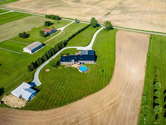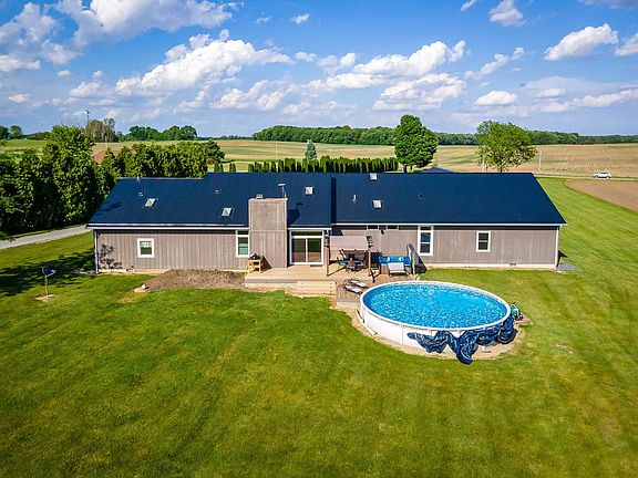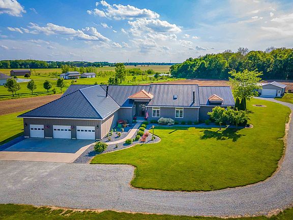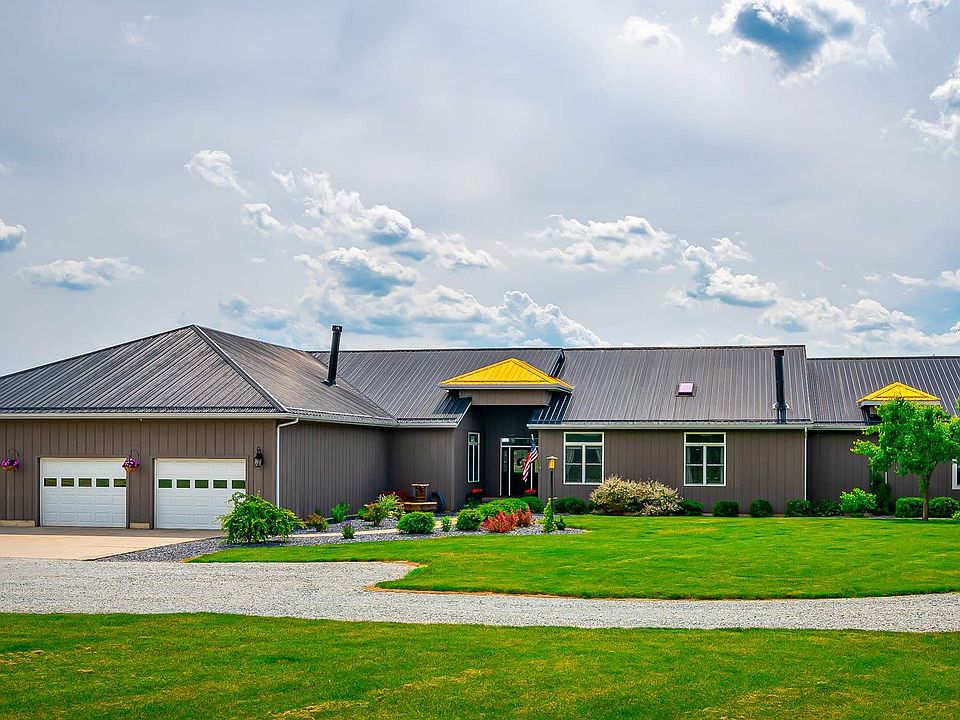 It's like you just stepped onto HGTV!!! Gorgeous ranch style home remodeled with every detail in mind! Meticulously maintained and upgraded! Located in a quiet rural setting on 10 acres of woods, beautifully landscaped lawn, and expansive fields; this completely redesigned home provides over 4500 square feet of living space all on one floor. This house boasts open 10ft ceilings with skylights providing the perfect amount of natural light through the entire home. Each room is designed with upgraded paint, modern flooring, and deluxe fixtures. You will have all the storage you'll need with thoughtful spacious closets in every room, and built-in shelving, perfect for keeping organized. Create cooking masterpieces with stainless steel appliances, electric cooktop, TWO pantries, and a built-in oven in the completely updated modern kitchen. Serve meals at the eat-in kitchen bar, or in the formal dining room, complete with a fireplace. Relax by the fireplace in the open concept living room, or walk out the back door to take advantage of the wood deck with views of the woods & dive into the pool & hot tub! The office off the living room features bamboo flooring, and offers plenty of room for work; or use as an additional bedroom. Enjoy the privacy of a split bedroom floor plan in the tremendous master suite; complete with his & her walk-in closets, en suite bathroom with jetted tub, double sink vanity, and luxurious tiled shower. The ideal place for rest and relaxation. The three car attached garage with added shelving, paired with two additional outbuildings, is perfect for storage, working on cars, or creating a workshop! Brand new metal roof, geothermal heat, triple pane windows, and a massive newly renovated guest bathroom with double vanity, separate tub, and gorgeous tiled shower, are just a few of the great features this home has to offer. Home Details: Steel Roof in May 2019, Outbuilding built in 2019, surround sound, central vac, alarm system and so much more!