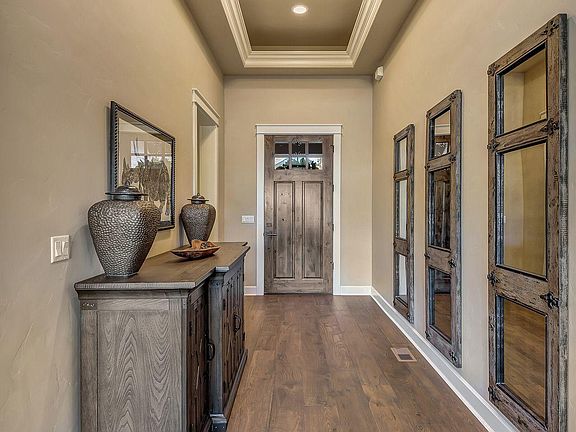 Thoughtfully positioned on a double corner lot, enjoy the privacy of no neighbors on either side or behind you. Single level home showcases elevation that lets you gaze out over the tree tops and enjoy the expansive views of the city and hills. Views are captured in nearly every picture window, or enjoyed from your covered patio. Great room design maximizes its square footage w/luxury finish work throughout including hardwood floors, trendy tile slab counter tops and elegant lighting. Garage is finished with hand textured walls, and epoxy floors with bump out for your recreational toys/golf cart, and office is perfect for working from home. Boundary fence allows for privacy and pets, with low maintenance yard and dramatic custom water feature. Walk to the driving range, or enjoy direct access to the river trail and walk or bike to downtown. Exceptionally maintained and offering private low maintenance living minutes from town, trails and parks!
