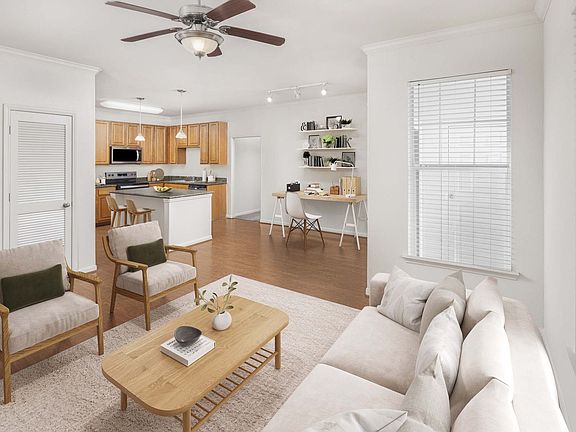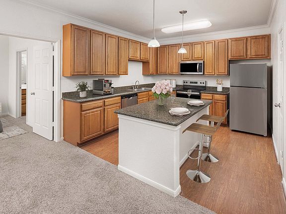 DimensionsSquare Feet - 811Living Room - 12'0" x 15'10"Dining Room - 7'10" x 10'7"Bedroom - 11'0" x 11'9"DescriptionThis one bedroom, one bathroom floor plan includes a full size washer and dryer, oversized walk-in closet, kitchen island, and large soaking tub.