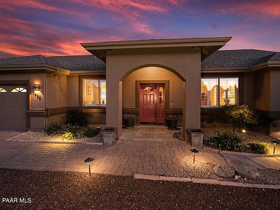An immaculate, beautiful and highly upgraded Chino Valley home on a large corner lot with outstanding curb appeal and your own park in the backyard. Walking up the expansive and impressive paver driveway (with walkways) and entering the home, there's an office or flex room on one side of the foyer and then a formal dining room, setting up a large open great room concept with soaring vaulted ceilings and a floor-to-ceiling drystack stone gas fireplace complete with blower attachment. You'll also immediately notice the neutral paint scheme, fabulous lighting, wood laminate and tiled floors (no carpets at all!) and attractive and practical plantation shutters throughout the home. The remodeled kitchen features decorative glass front underlit cabinets, updated granite countertops with granite