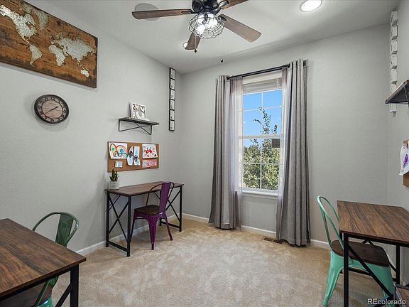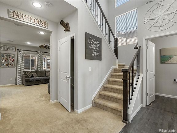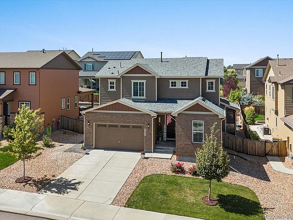 Welcome to the Terrain neighborhood, only 5 minutes from downtown Castle Rock! As you enter the home you will be greeted by grand vaulted ceilings in the entry way, which will lead you into the open concept living room, dining room and kitchen areas. The kitchen boasts a beautiful large granite island, stainless steel appliances and a walk-in pantry. The living room area has a gas fireplace for you to enjoy the cozy weather of Colorado! As we walk upstairs, you will find the large primary bedroom with a great view of the backyard, which opens to the primary bathroom. Updated custom tile shower, updated lights and mirrors, a large walk-in closet and extra linen closet. Down the hall we will find another two bedrooms, secondary bathroom with tub/shower combo and a very spacious laundry room with a great storage shelf at the end of the hall. Back downstairs, you will find a fully finished basement, which boasts epoxy floors, 3 Murphy Bookshelves to hide storage and two crawl spaces for extra storage, and a custom stacked stone feature wall with a reclaimed wood accent. You will find a bedroom, bathroom and living area in the finished basement space as well! The bathroom has a beautifully finished tub/shower combo, updated vanity with storage and updated lights. Last but not least, the amazing backyard covered patio with a custom reclaimed wood ceiling, a bar top/food prep area down below with three beverage refrigerators (included) and space for a barbecue. You will notice beautiful, stamped concrete starting from the dining room slider door, which wraps around the whole patio to the back gate. Beautifully landscaped with Aspen and Maple trees, along with two large, raised garden beds with built-in drip system. Don’t forget the Rachio sprinkler system (included) for the front yard and backyard sprinklers, and the upgraded Class 4 roof installed March 2022. This home has many smart features that can be controlled with an app on your phone. Don’t miss this one!