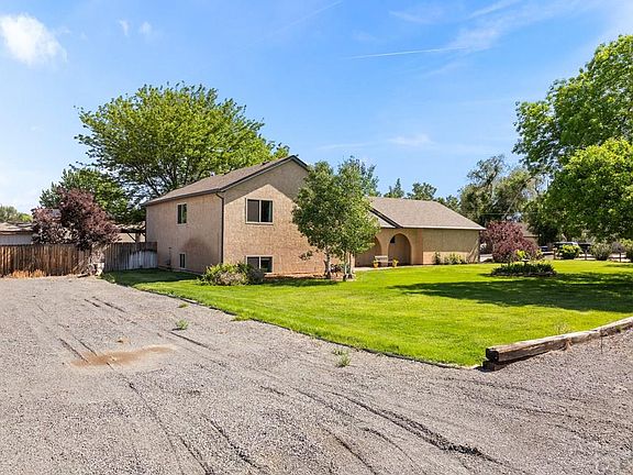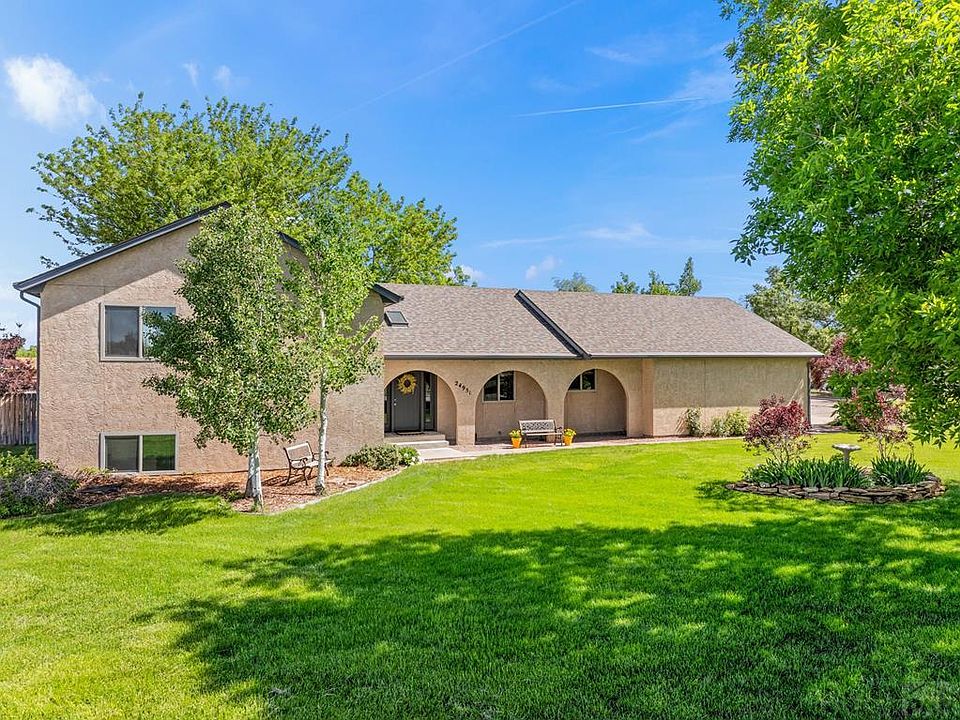 Escape to country living with this stunning 4-level home, nestled on a 1 acre lot on the mesa. Offering 5 bedrooms, 4 bathrooms, and plenty of room for both comfort and entertainment. As you enter the home, you'll be greeted by elegant hardwood flooring throughout the living room and dining area, complementing the vaulted ceilings and a grand stacked-stone fireplace that stretches from floor to ceiling. The kitchen is equipped with ample cabinet space, sleek granite countertops, and a central island, creating an ideal space for meal preparation and entertaining. The spacious primary bedroom is a peaceful retreat, featuring a large walk-in closet and an ensuite bath with a beautifully tiled walk-in shower. Notable updates throughout the home include new doors and windows, new carpet, a new septic tank, and energy-efficient solar panels. Outside, the expansive backyard features a serene pond and a charming gazebo — perfect for relaxing or hosting outdoor gatherings while enjoying the natural surroundings. In addition to the 2-car attached garage, the property includes barn with attic storage and several outbuildings, including a massive 30x60 metal building, providing ample space for storage, workshops, or hobbies. This property offers the best of country living on the mesa with modern upgrades, spacious living areas, and peaceful outdoor settings. Don't miss the opportunity to make this remarkable home yours!