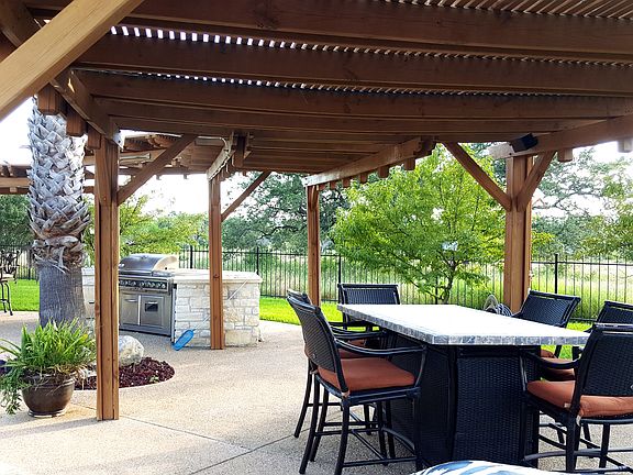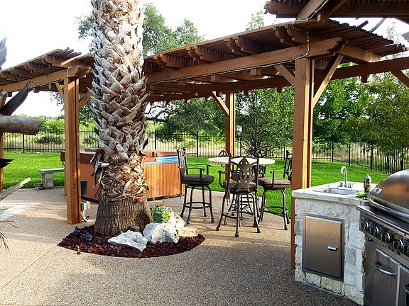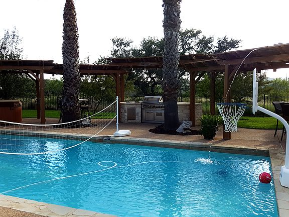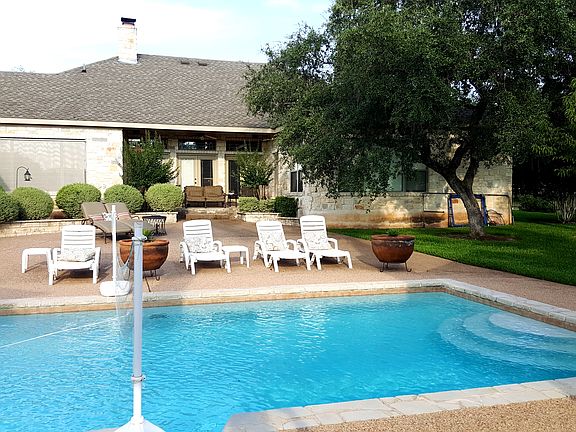 This handsome, solid-built Austin rustic gated home is in the middle of nearly 5 glorious acres, a wildflower beauty with groomed fenced yard, sparkling pool, cabana, built-in outdoor kitchen, fruit and palm trees and a fantastic 2400 sq ft workshop with 3 bays. (40 X 60) Architecturally pleasing rich wood interior and exterior, crown moulding and wood accents throughout, granite kitchen, stainless steel appliances, island, built-in wine cooler and open kitchen to 2nd living, striking Texas oak wood flooring, Brazilian granite, lots of windows. Austin stone exterior. Over 100 oak trees. 300' ft deep well. Plenty of room to build more on this land. Community ramp lake access. LTISD bus pick up. Serene country setting on a corner lot, yet only 15 minutes to major shopping. Over 100 oak trees. 300' deep well for excellent water intake. Hill country views abound! The Zestimate provided by Zillow does not include the 2400 sq ft workshop that was site built and not a kit. It may not have considered the pool, which must be considered when pricing this home. Zillow's Zestimate is not an appraisal, but merely a guesstimate based on area sales.