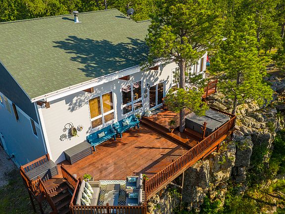 Your home will be the gathering place for family & cherished friends as you invite them out on the western deck to watch the carving progression of Crazy Horse...the world's largest mountain carving! As you take in this million $$ view, dip into the hot tub on the bespoke deck that spans the entire back of the home & built around the natural formations of the rock & pines. Feel the warmth of the Black Hills sunshine, listen to the wind whisper through the pines & finally, breath deep that wonderful pine aroma. In the morning, watch the sign rise on the courtyard carved among the boulders and listen to the golden leaves of the Aspen trees quaking in the fall or gaze at the freshly-powdered Ponderosa in the winter. Ready for a fire? Grab a Pendleton blanket; guide your guests to the fire feature built on boulders & watch the stars at night with little to no light distraction. Here, at Mica Ridge, you are buying one of the most amazing locations in the Black Hills. The 28.3 acres this home sits on are mostly-forested teaming with elk, deer & turkey. The entire back lot line is Forest Service, so it is yours to enjoy as well on horse, foot or ATV. As much as this custom-built tri-level home was built for the outdoors, we can't overlook the luxurious indoor features: Viking cook stove & double ovens, Bosch refrigerator, Knotted Hickory cabinets, custom oak woodwork, solid Knotty Alder doors, Marvin steel-clad tilt out windows, rich stone fireplaces & wine cellar.