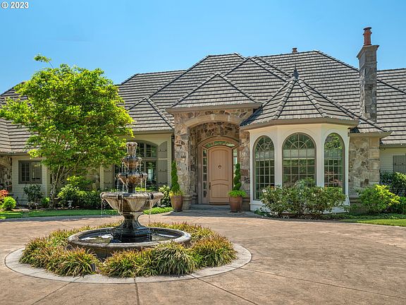 Sitting behind a private gate, this magnificent 4.81 acre estate is summer living at its finest! At almost 8,000SF, with 4 bedrooms, 5.2 bathrooms, the house itself was built in 2006, then updated in 2016 with over $500,000 in improvements by the current owners after purchasing the estate from a former Portland Trailblazer. The grounds alone feature a full size lighted tennis court, pool with a wet slide, spa, multiple patio lounge areas, pool house with separate massage room, putting green, lush landscaping, a level grass field for event hosting, and paved trails throughout the property. Also included is an interior basketball / sports court with a roller door with views of the quarry!Inside, the elegant entry introduces the formal dining room, an executive office to the right, and opens straight into a great room with 15' ceilings and overlooking the coast range. The primary suite offers two massive walk in closets, a stately primary bathroom with exquisite finishes, and dedicated washer and dryer. The gourmet kitchen is classy, functional, and ideal for entertaining. It has a 12' quartz cook island, counterspace galore, pantry, and a generous nook area with wine and beverage fridges. Adjacent is a breakfast area to the indoor basketball / sports court and opens to a large covered patio complete with a built in BBQ and fireplace. The lower level includes high ceilings and has a generous family room with sliders to the back patio, dedicated pool table room, wet bar, two additional bedrooms, both with bathrooms, one with its own patio, and multiple storage rooms. The entire house has boiler heating in the floors and central air conditioning. A backup generator for power outage protection. All this with soaring views, a large apron for cars, plus a five car garages for all your toys!