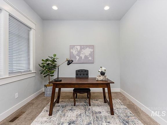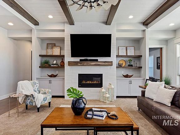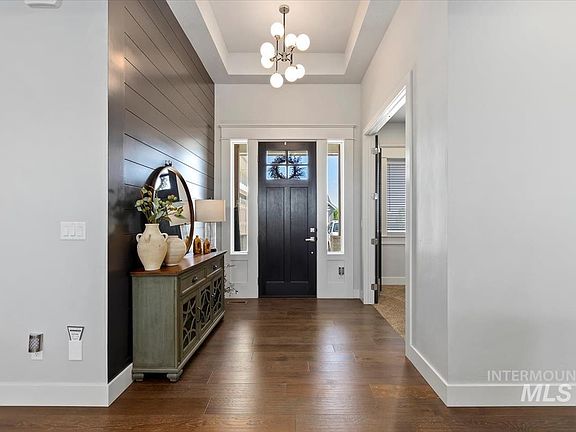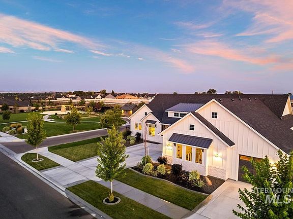 HUGE PRICE IMPROVEMENT on this beautiful home in East Ridge in S. Meridian! Don't miss this exceptional split master home with 4 bedrooms plus office plus bonus/movie room! Highly upgraded and modern finishes throughout. Gourmet kitchen with ceiling-height custom cabinetry, super-sized island and Bosch appliances. Large great room with 11' ceilings and faux beams. Beautiful fireplace with custom flanking shelving. Extensive hard-surface flooring, soaring high ceilings with crown molding and designer-inspired details, 8' interior doors, coffee bar / wet bar with mini fridge, mud room cabinetry, large walk-in pantry. This home is situated on a fully landscaped and fenced corner lot with a sport court / pickleball court in the back yard! Next to community park. Oversized 3-car garage. 3rd bay has separate entrance / driveway. Covered patio perfect for indoor / outdoor living.